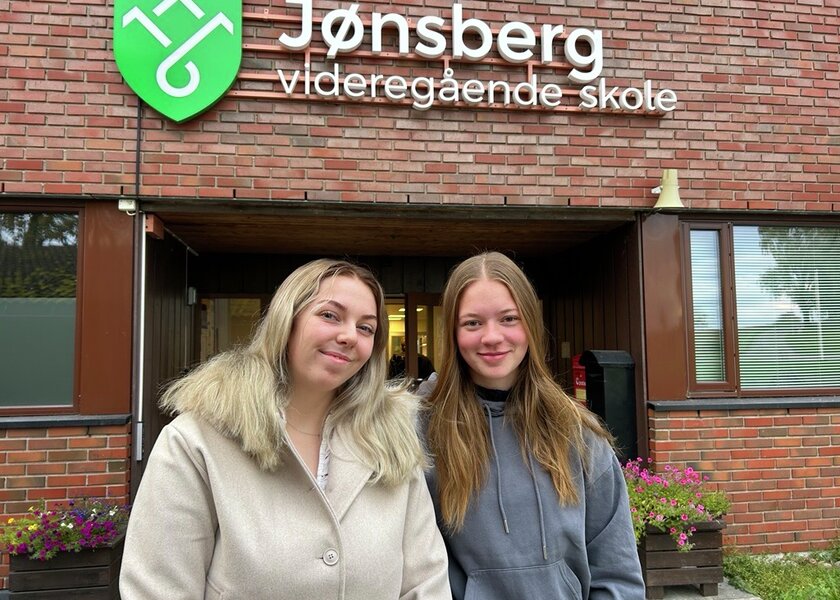 To elever som står forran hovedinngangen til skolen. - Klikk for stort bildeElevrådsleder Mathilde Hatterud (t.v.) fra 3C og nestleder Tilde Bekkevoll fra 1B skoleåret 2025-26. Jønsberg vgs.